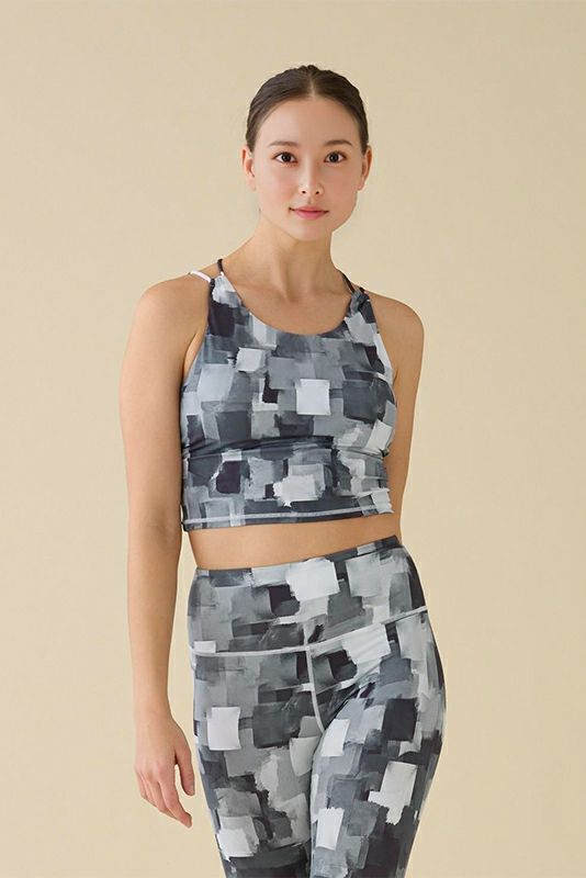 suriaのオリジナル、油彩柄のプリント。前はクルーネックでしっかりホールドしつつ、後ろはクロスデザインで綺麗な肌見せが叶うブラトップです。同柄の