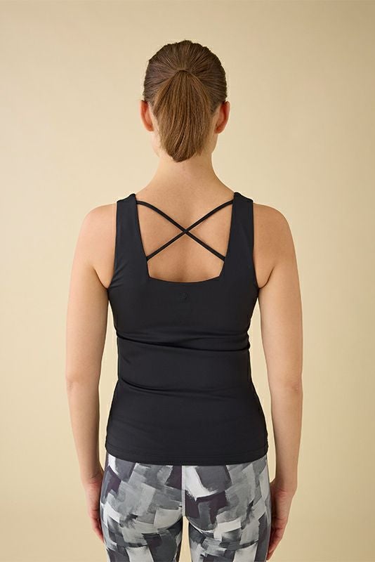 背中部分がクロスデザインになっているブラ付きのタンクトップ。スッキリしたシルエットなので激しい動きや姿勢を意識する必要のあるピラティスなどにおすすめです。ゆったりした後ろあきのトップスなどと合わせてバッククロス部分を見せるのも◎。
