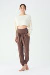 着心地抜群の快適さ。ゆとりと十分なストレッチ性があり、リラックスして履けるシルエットになっています。ウエストまわりが綺麗に見えるウエストベルトのカーブも特徴。コンパクトなトップスと相性の良いパンツです。