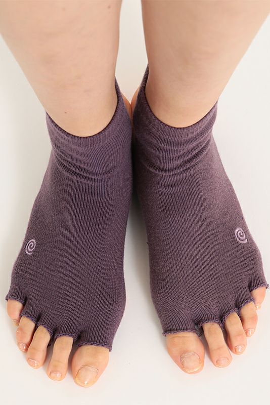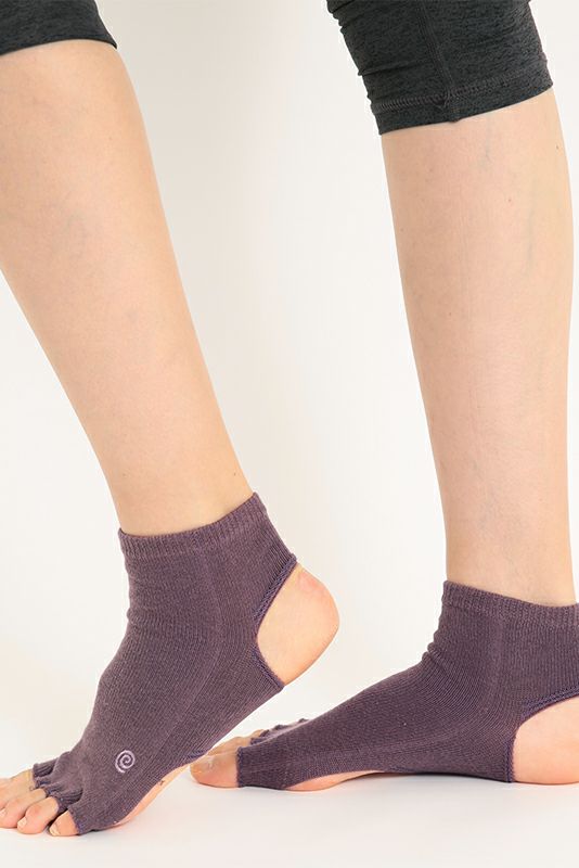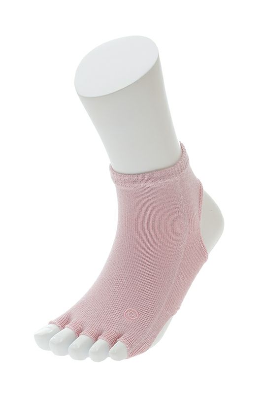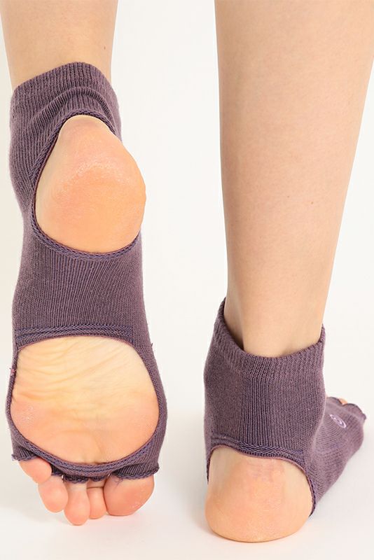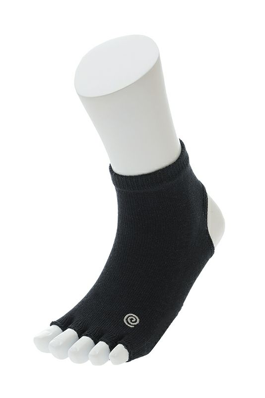 指先なしの五本指ソックスのアンクレット(足首)丈。 足の甲は全面カバーしつつ、足裏に開いた2つの大きな穴で母子球とかかとが出る形。 足の甲を守りながら裸足に近いグリップ感が得られるヨギーニの必需品。