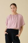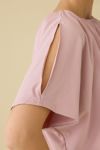 ギャザーをふんだんに入れてバルーンのようなボリューム感を出し、トレンドのシルエットをヨガウェアに落とし込みました。肩のスリット部分から腕を出してノースリーブのようにも着られます。
