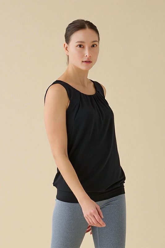 お腹周りはゆったりしていて安心感のあるデザインです。前衿部分にギャザーとタックでアクセントになっています。