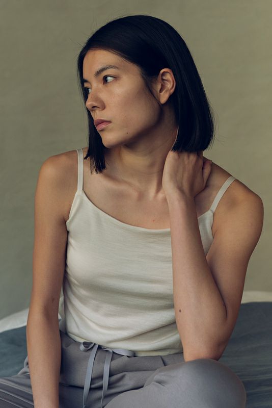 ややショート丈で、脇のウエスト部分にギャザーが入っています。肩紐は華奢なストレッチテープを使用し、実用性を兼ね備えながら綺麗な印象にまとめました。ウールは天然の機能素材と言われており、今や冬だけでなく通年の素材として認知が広まっています。登山をする人にとってはインナーとしてお馴染みのウールは、汗をかいても身体を冷やしにくい調温効果、防しわ、吸放湿性、消臭、そして最終的には土に還るサスティナブルな素材でもあります。ウールは洗えないというイメージもある中、今回はウォッシャブルの加工をした素材を使用しています。