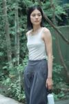 肩紐を細くし、衿のスクエアネックがヘルシーな印象。後ろは肩甲骨に沿ってカーブになっているので身体の動きの邪魔をしません。股部分にスナップが付いているのでポーズの際にめくれたり、裾が表に出てこないのがポイントです。