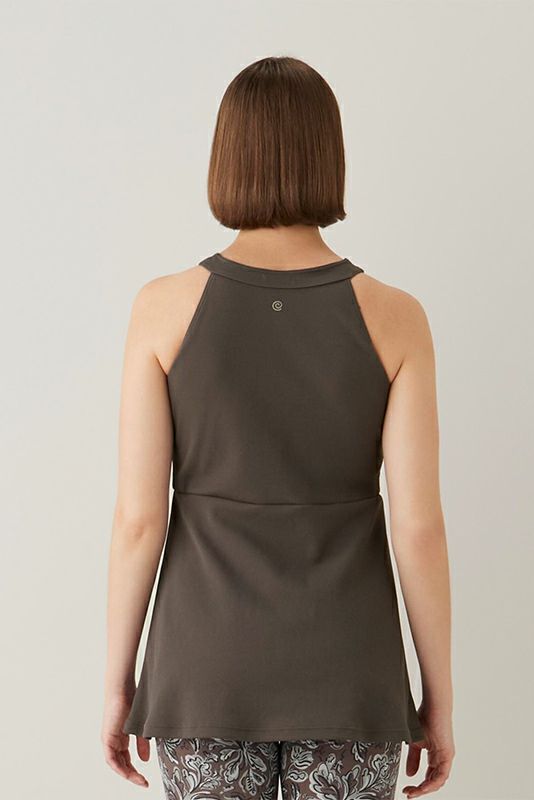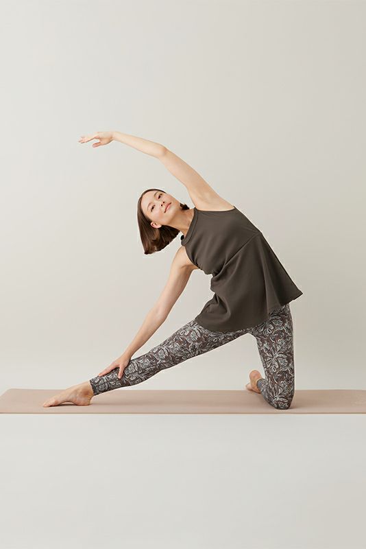 表面に凹凸感のある特徴的な素材を使用。やや長めの丈で気になるヒップ周りをカバーしつつ、裾までインナー付きなので、逆転のポーズでもインナーをボトムインすればお腹が見えない安心のデザインです。