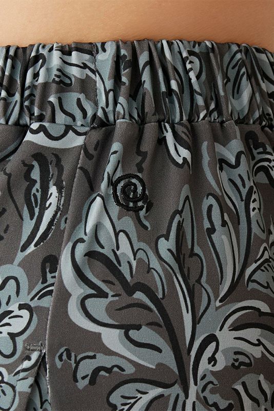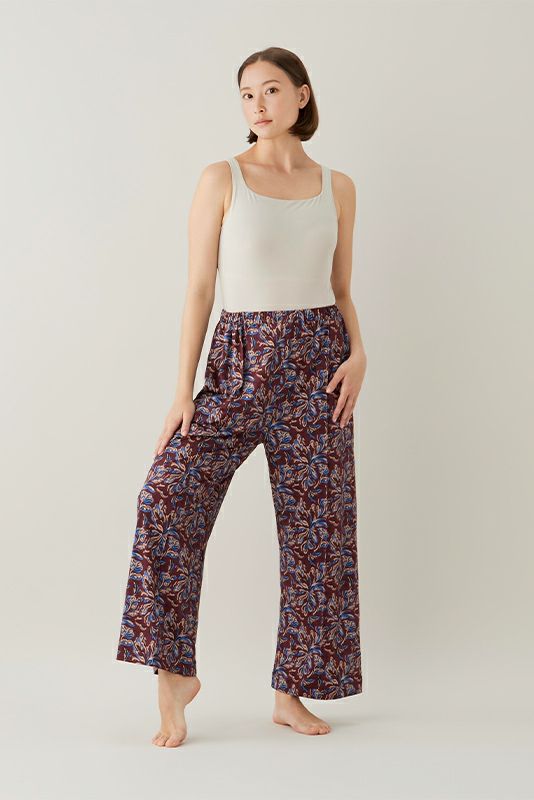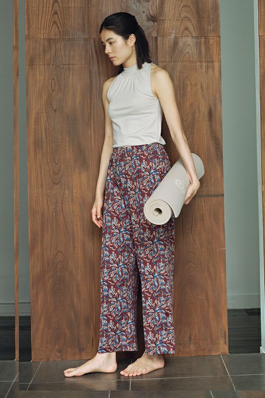 持ち味である手描きのやわらかな曲線美を活かし、ボタニカル柄をオリジナルで描き下ろしていただきました。ウエストがぐるりゴムになっており、内側には調整用の紐が通っています。シルエットはゆったりワイドで、リラックス系のヨガのほか、スタジオの行き帰りや普段使いにもおすすめの1本です。