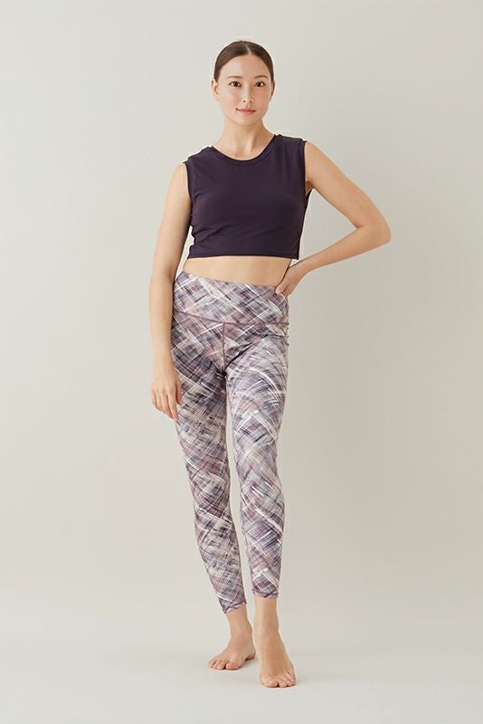 斜めに入った柄が脚をすらりと見せてくれる、suriaならではのオリジナルデザインです。どんなトップスにも合わせやすいようにニュアンスカラーでまとめています。もはやsuriaの代名詞となっている4WAYストレッチ素材で動きにストレスのないレギンスです。