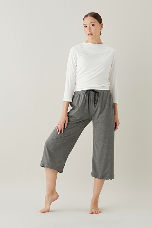 吸水速乾性のあるリラックスできるパンツ。裾はゴムが入っており絞ることでずり落ちることもなく、シルエットを変えて楽しむこともできます。