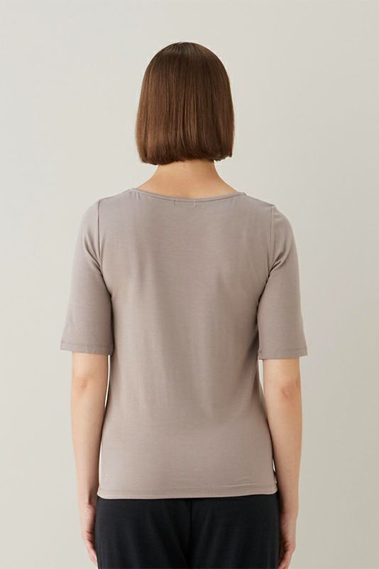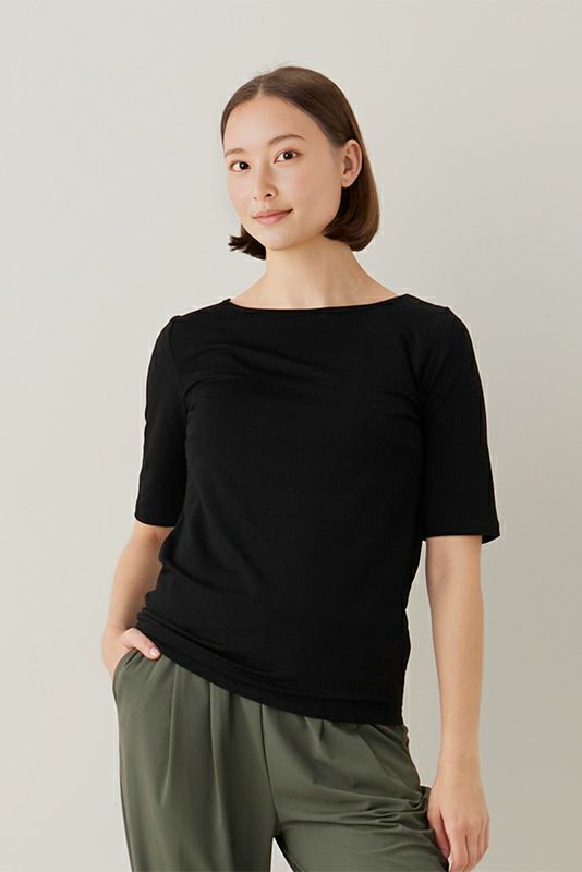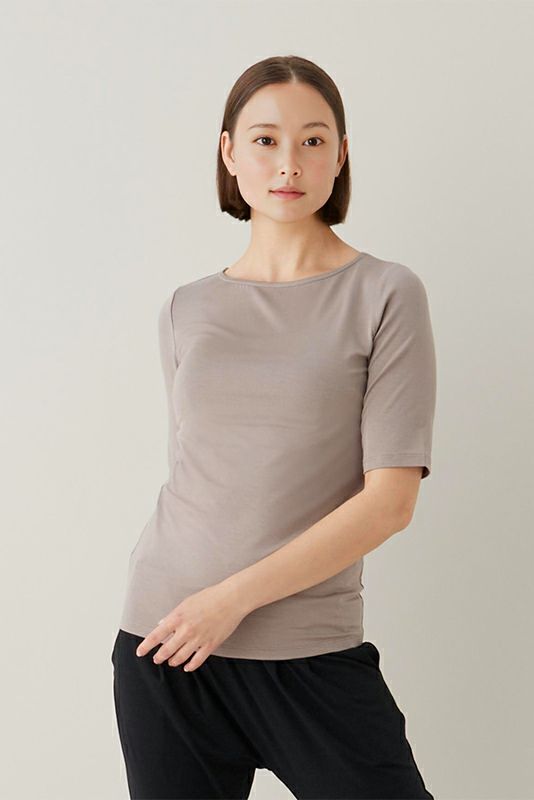 シンプルながら首周りが綺麗に見えるよう、衿のラインにこだわっています。袖はやや長めの肘上丈で、気になる二の腕も綺麗に見せます。