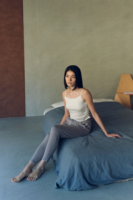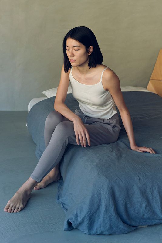 ややショート丈で、脇のウエスト部分にギャザーが入っています。肩紐は華奢なストレッチテープを使用し、実用性を兼ね備えながら綺麗な印象にまとめました。ウールは天然の機能素材と言われており、今や冬だけでなく通年の素材として認知が広まっています。登山をする人にとってはインナーとしてお馴染みのウールは、汗をかいても身体を冷やしにくい調温効果、防しわ、吸放湿性、消臭、そして最終的には土に還るサスティナブルな素材でもあります。ウールは洗えないというイメージもある中、今回はウォッシャブルの加工をした素材を使用しています。