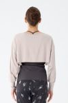オーバーサイズのショートトップとボレロの2WAYで着用可能。程よいボリューム感もポイントで、十分なストレッチ性があり、ノーストレスな着心地。ヒアルロン酸加工を施しており、吸い付くようなモイスチャータッチが一度着たらやめられない気持ち良さ。トップス単体として着用したり、肌寒い時の羽織としても。真夏以外ではほぼ使えるヘビーユースのトップスです。