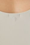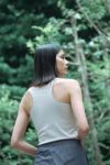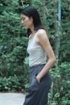 肩紐を細くし、衿のスクエアネックがヘルシーな印象。後ろは肩甲骨に沿ってカーブになっているので身体の動きの邪魔をしません。股部分にスナップが付いているのでポーズの際にめくれたり、裾が表に出てこないのがポイントです。