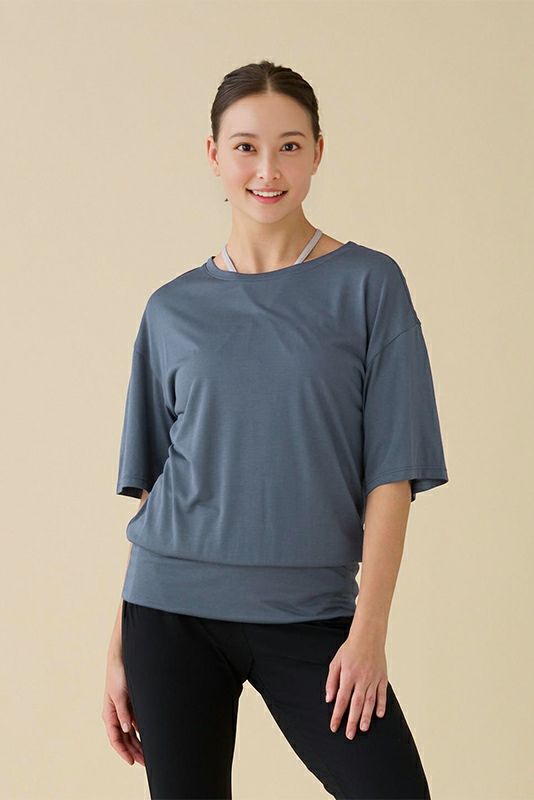 ゆったりビッグシルエットながら腰でしっかりとまるデザインです。後ろ中心の切り替え部分で縦にあきがあり、ベンチレーションになってるので風通しも◎。ストレッチ性があり動きやすく、天然の抗菌作用も。