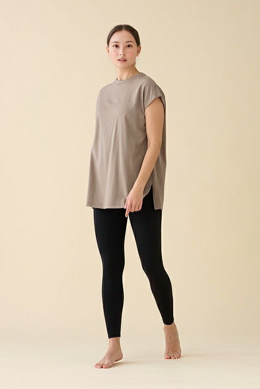 肩部分がタックになったロング丈のフレンチスリーブです。Plaxという注目の新エコ素材で、多機能ながら天然素材見えします。天然の抗菌性があり弱乳酸で肌にやさしく、水の使用量は綿と比べ90%削減、CO2排出量はポリエステルと比べ35%削減している環境に配慮した未来の素材です。