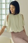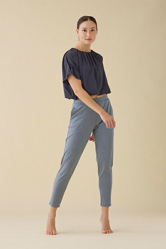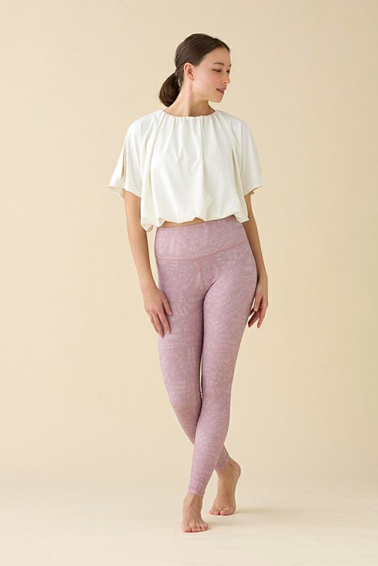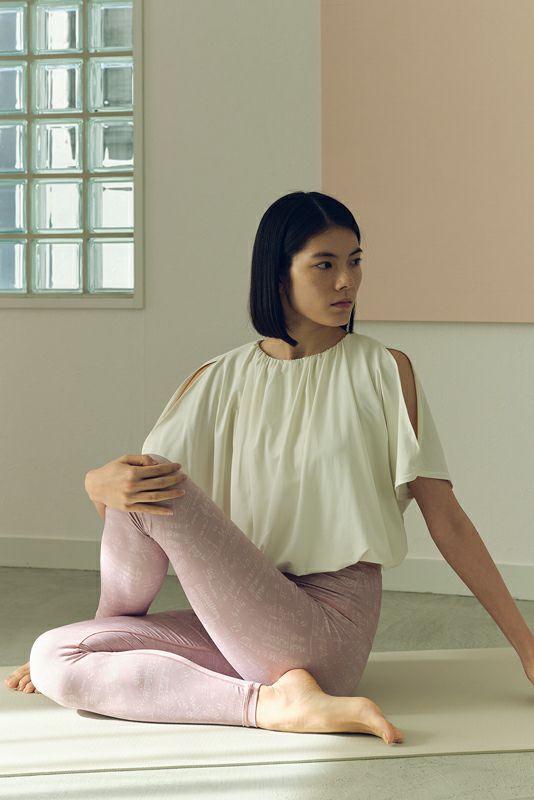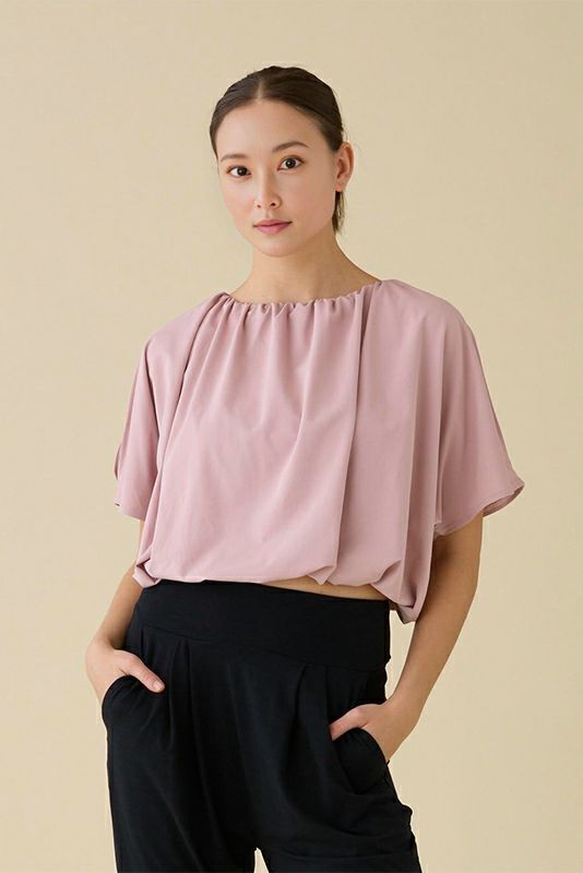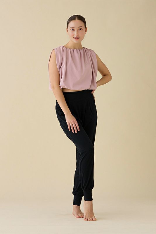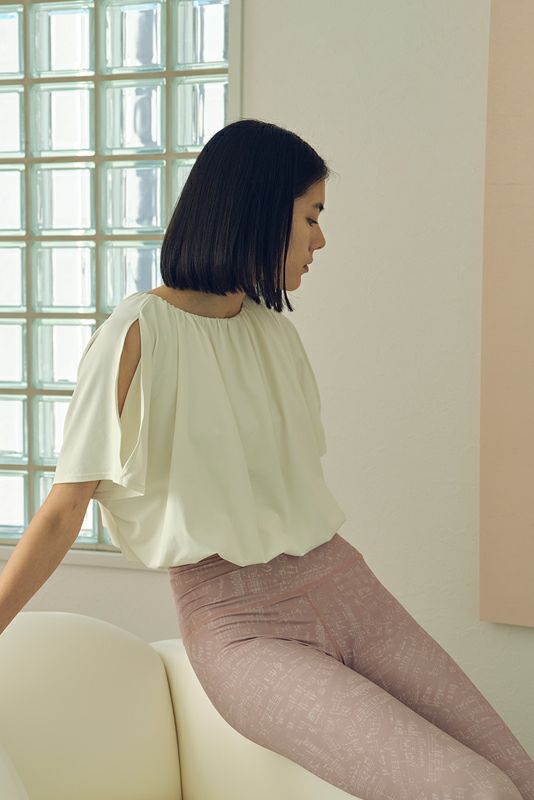 ギャザーをふんだんに入れてバルーンのようなボリューム感を出し、トレンドのシルエットをヨガウェアに落とし込みました。肩のスリット部分から腕を出してノースリーブのようにも着られます。
