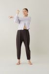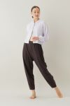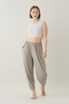ウエストがぐるりゴムのリラックスできるゆったりシルエットパンツです。膝部分はゆったり、裾にかけては細くなっており、カーブが美しく出るパターンになっています。