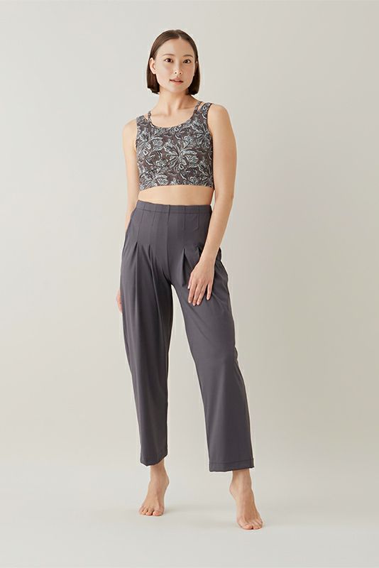 持ち味である手描きのやわらかな曲線美を活かし、ボタニカル柄をオリジナルで描き下ろしていただきました。シックでマチュアな印象のブラトップに仕上げています。4WAYストレッチで動きやすく、速乾性もあるのでホットヨガにも◎