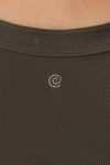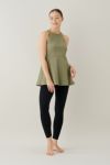 表面に凹凸感のある特徴的な素材を使用。やや長めの丈で気になるヒップ周りをカバーしつつ、裾までインナー付きなので、逆転のポーズでもインナーをボトムインすればお腹が見えない安心のデザインです。