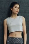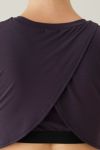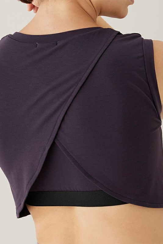 脇まわりをしっかりカバーする、ショート丈のカップ付きトップです。後ろのクロスしているディティールがデザインポイント。配色のゴムもポイントになっています。