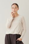表側に透けすぎないメッシュ素材を使用したショート丈トップ。バルーン型の裾はショート丈とのバランスが◎。カップ付きなので一枚でサマになります。