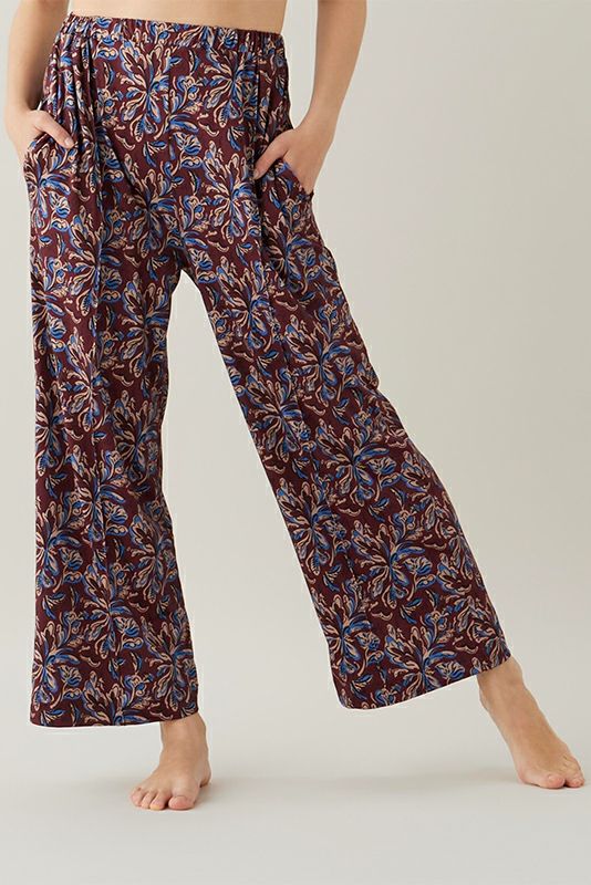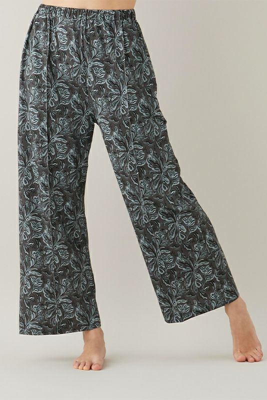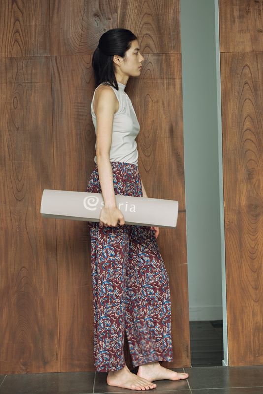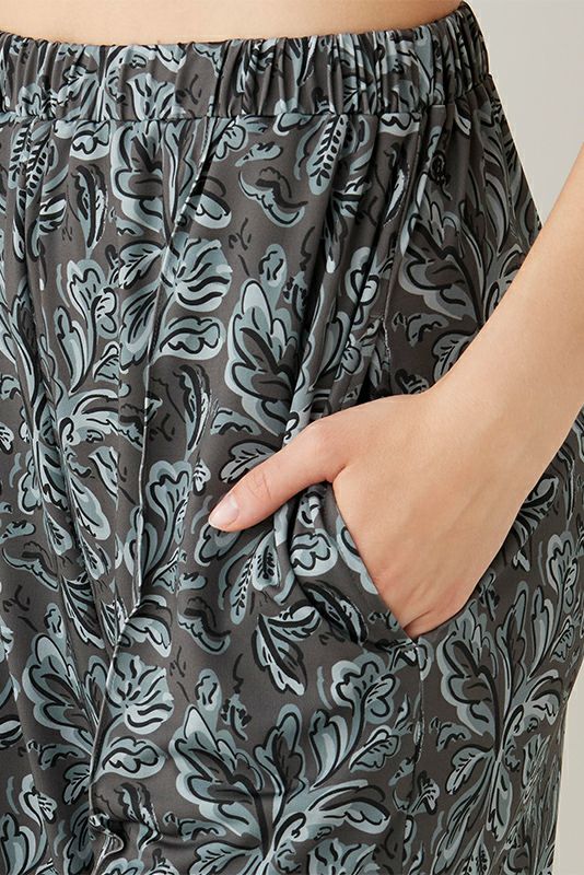 持ち味である手描きのやわらかな曲線美を活かし、ボタニカル柄をオリジナルで描き下ろしていただきました。ウエストがぐるりゴムになっており、内側には調整用の紐が通っています。シルエットはゆったりワイドで、リラックス系のヨガのほか、スタジオの行き帰りや普段使いにもおすすめの1本です。