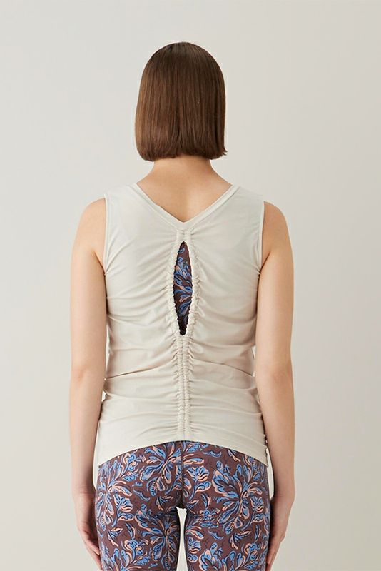 前から見るとスッキリしたデザインですが、後ろにはふんだんにギャザーが入ったノースリーブのプルオーバーです。前後逆にして着用もできますのでその日の気分でコーデが可能に。