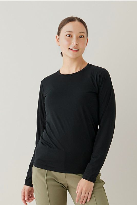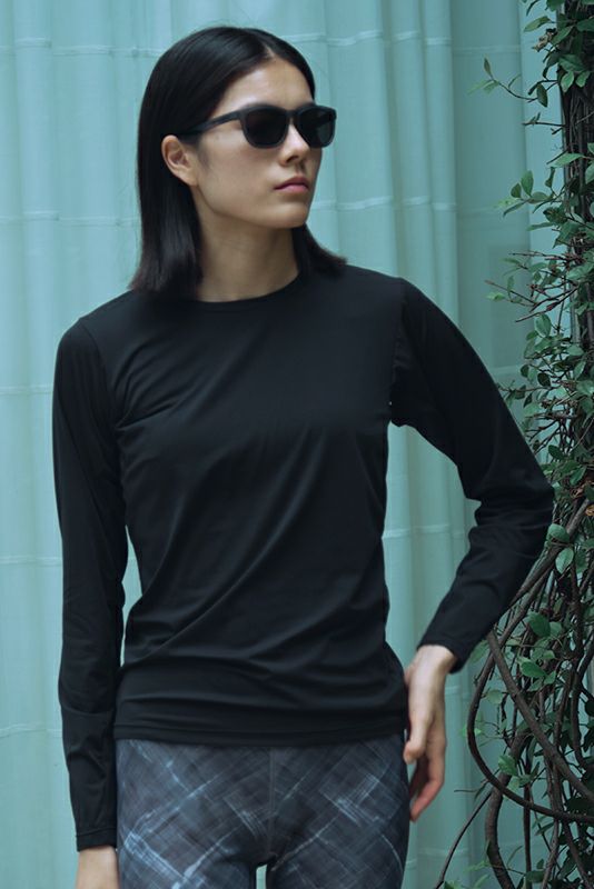 袖下にマチが付いており、腕の可動域が広がりやすい長袖プルオーバーです。やや細身で身体に程よくフィットするので、ピラティスやマシーントレーニングなどにもおすすめです。素材は多機能で耐久性もある、安定のスポーツウェア素材を使用しています。