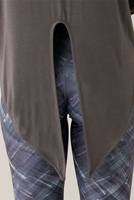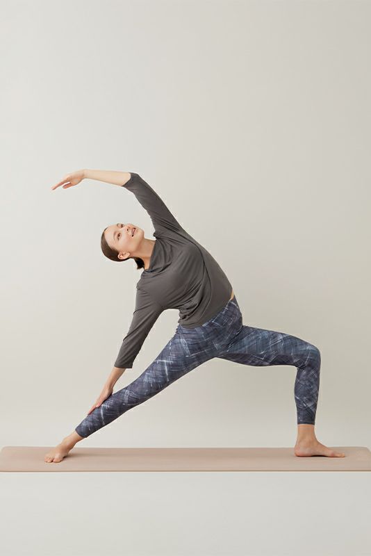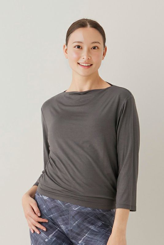 とろみのあるショート丈トップス。動きが多いポーズの場合は後ろを結んで着用してみたり、リラックスヨガの時は結ばず垂らして生地の滑らかさを生かす着こなしも◎