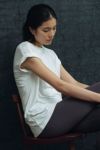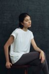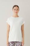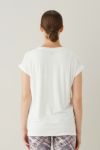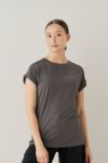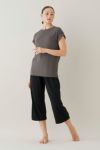 バンブー素材のロング丈半袖プルオーバー。シンプルな見え方ながら肩部分の切り替えが特徴的なデザインになっています。ヒップが隠れる着丈はレギンスコーデとも相性◎