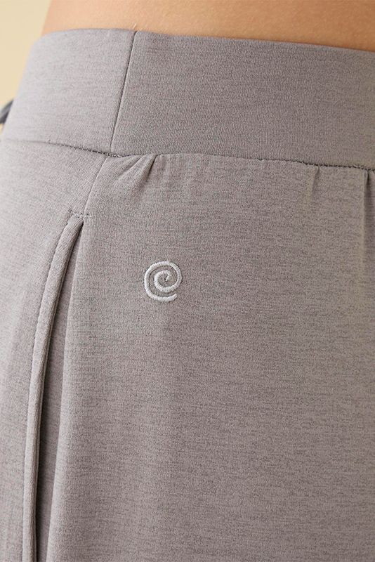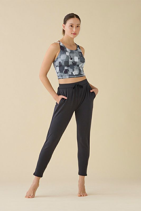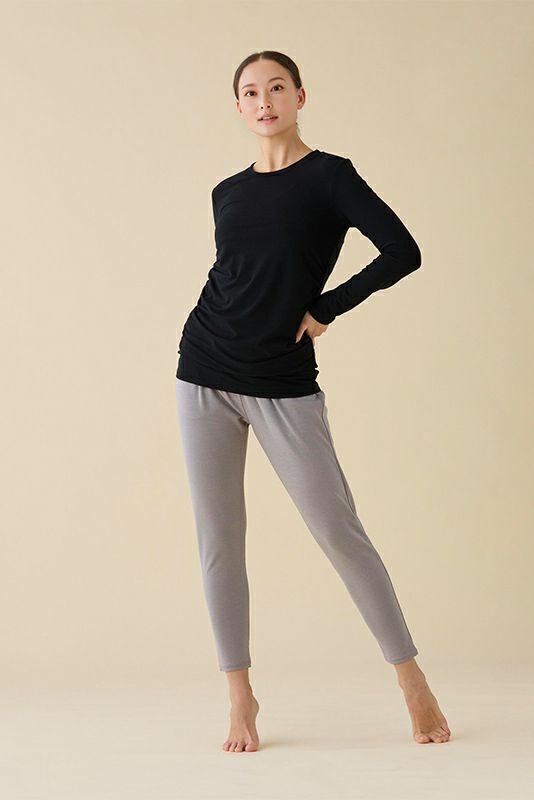 しなやかな伸びと適度な厚みのダブルニットで作った、スッキリ細身のテーパードパンツ。ウエストの紐でサイズ調整が可能です。