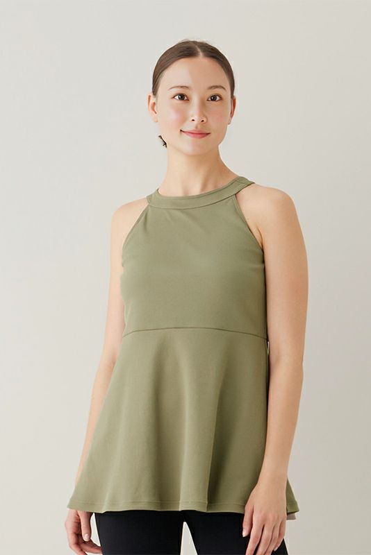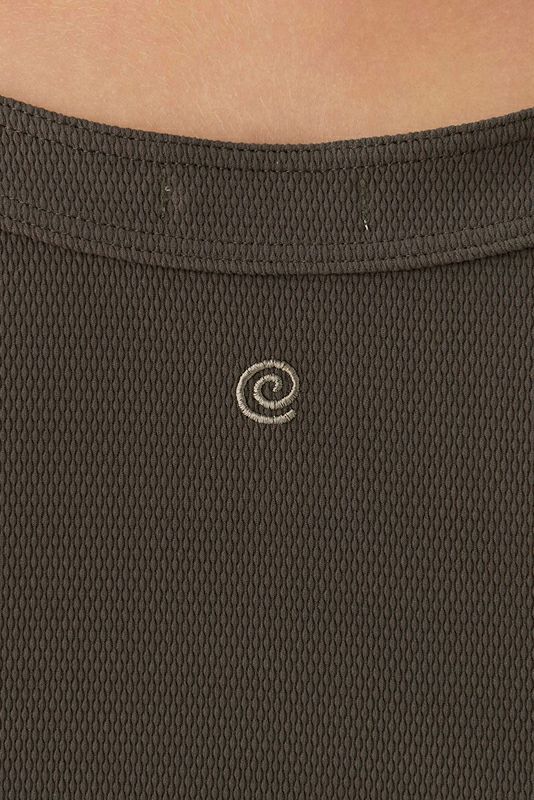 表面に凹凸感のある特徴的な素材を使用。やや長めの丈で気になるヒップ周りをカバーしつつ、裾までインナー付きなので、逆転のポーズでもインナーをボトムインすればお腹が見えない安心のデザインです。