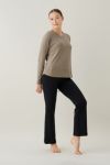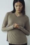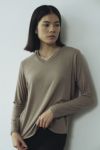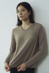 程よい深さのVネックは、首周りをスッキリ綺麗にみせてくれます。バックスタイルには、肩甲骨の動きを妨げない工夫をプラス。動きやすさをキープしつつ、ほどよくヒップをカバーしてくれる丈感も◎保温性と吸湿発熱機能付きで、寒い日もあたたかく快適に過ごせます。