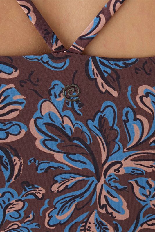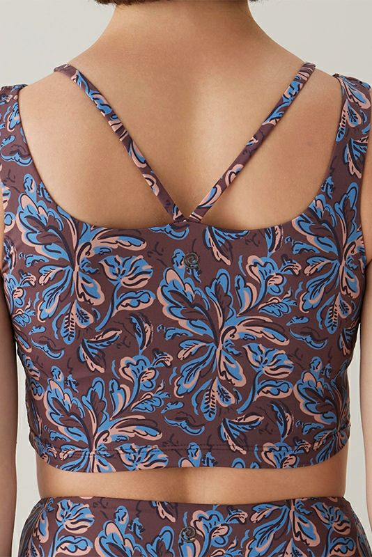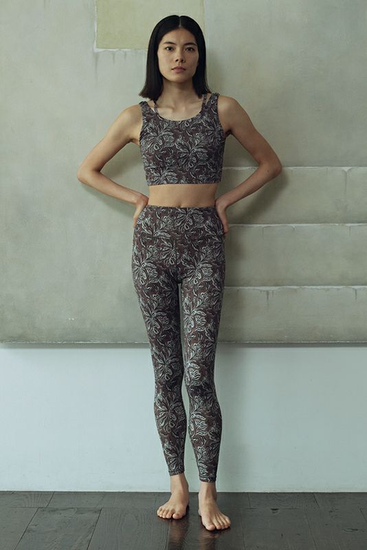 持ち味である手描きのやわらかな曲線美を活かし、ボタニカル柄をオリジナルで描き下ろしていただきました。シックでマチュアな印象のブラトップに仕上げています。4WAYストレッチで動きやすく、速乾性もあるのでホットヨガにも◎