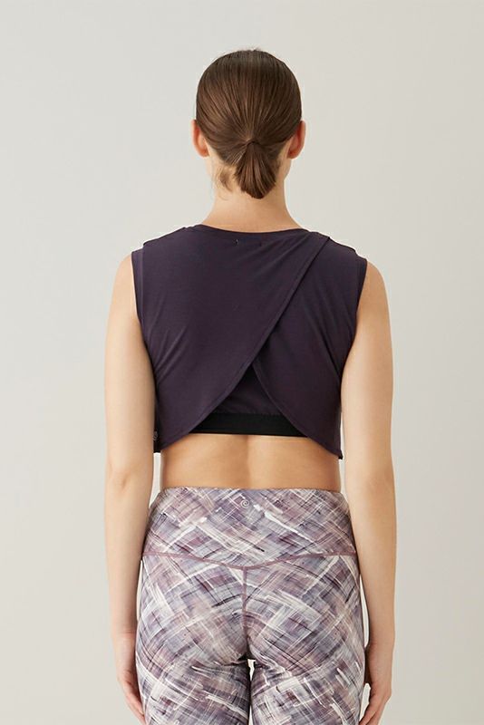 脇まわりをしっかりカバーする、ショート丈のカップ付きトップです。後ろのクロスしているディティールがデザインポイント。配色のゴムもポイントになっています。