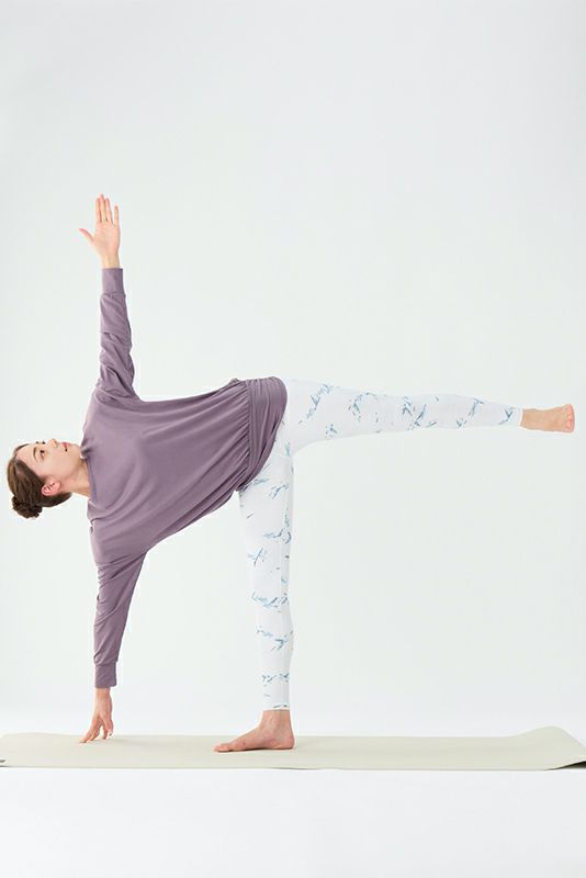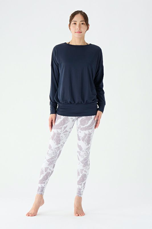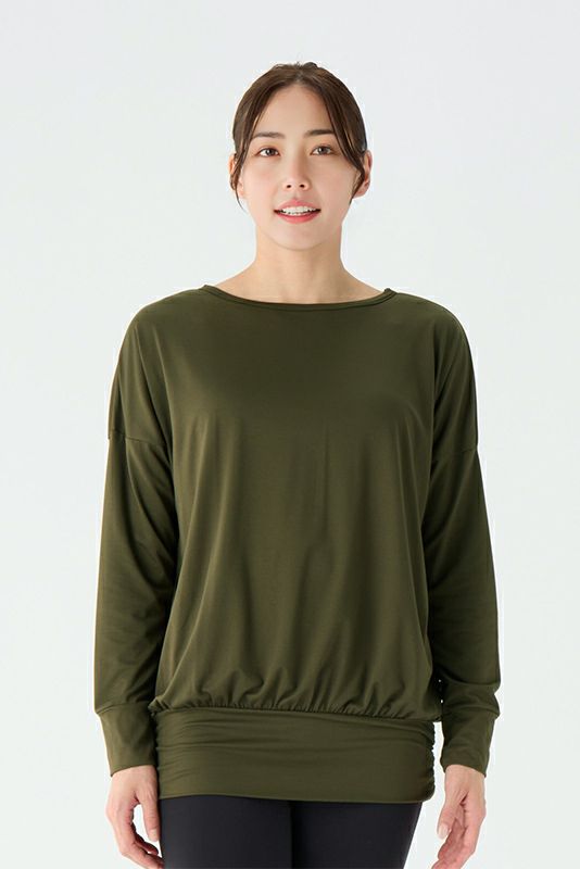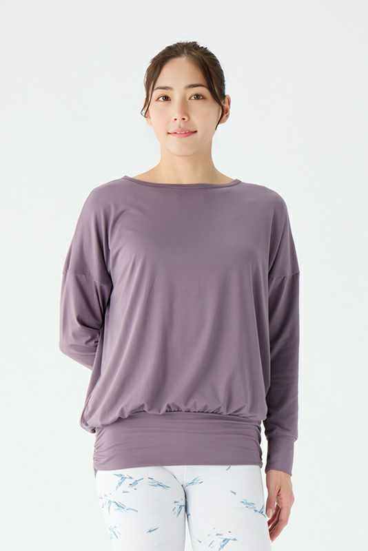 バックデザインがフェミニンな印象のトップス。程よい分量感で身体のラインを拾わず、裾は後ろが長いデザインでヒップまわりも綺麗に魅せてくれます。しっかり止まる裾の仕様で動きの妨げにならないのでポーズに集中できます。