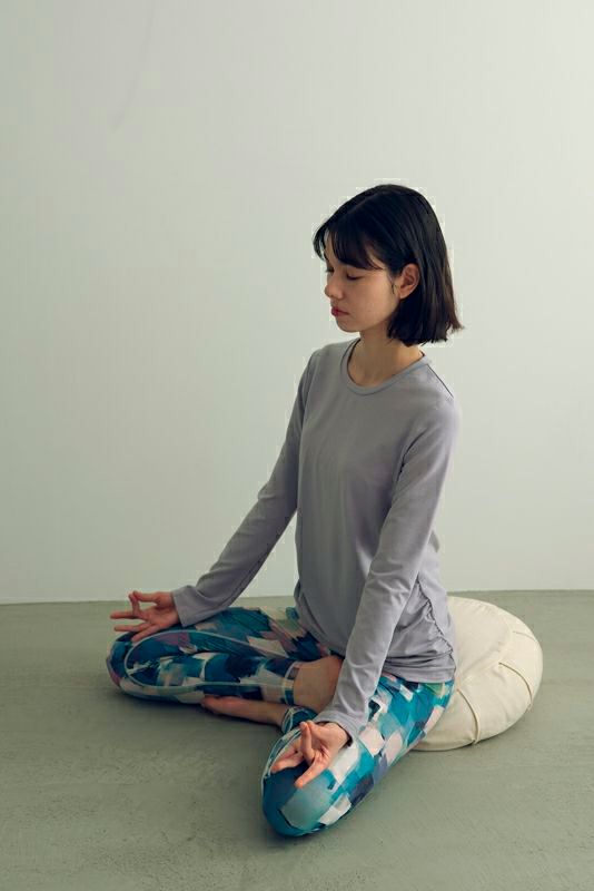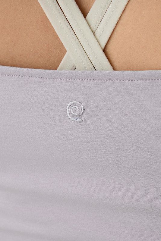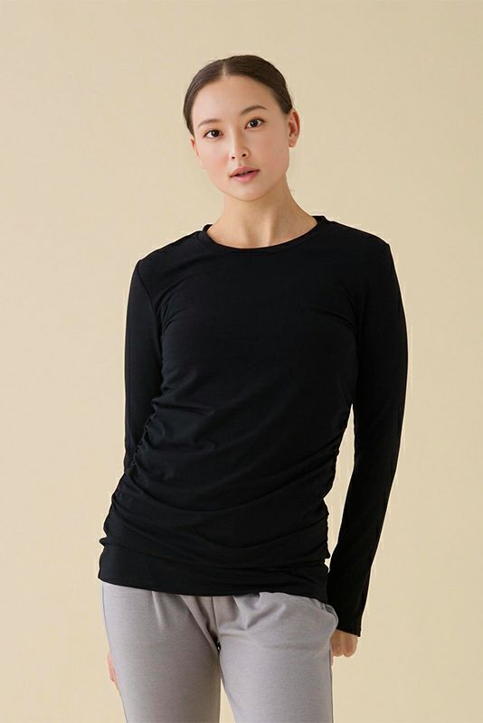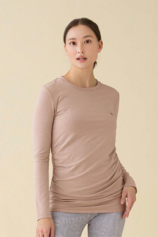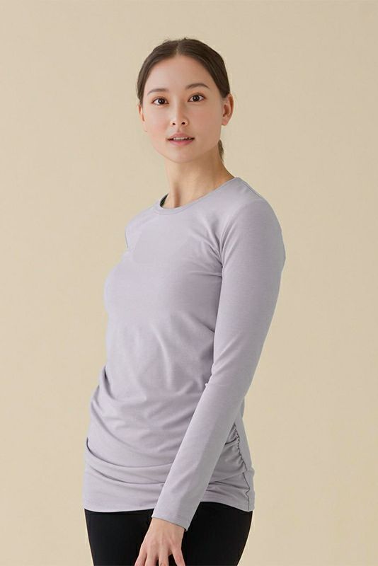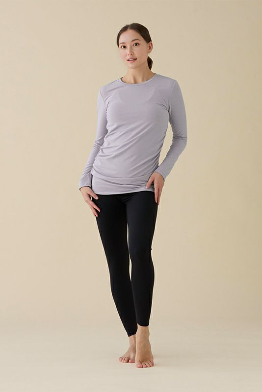 コンパクトなサイズ感なのでヨガの動きにもしっかりフィットして快適な着心地です。汗染みが目立たないような加工をした生地を使用しています。サイドから中心にかけて入ったギャザーが、フィットしたラインを美しくカバー。背中のヘルシーな開きもポイント。