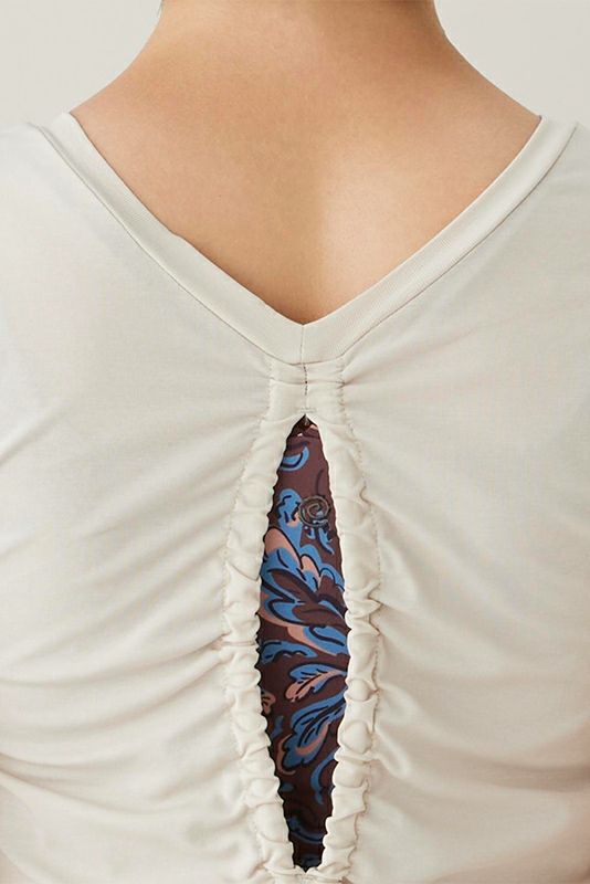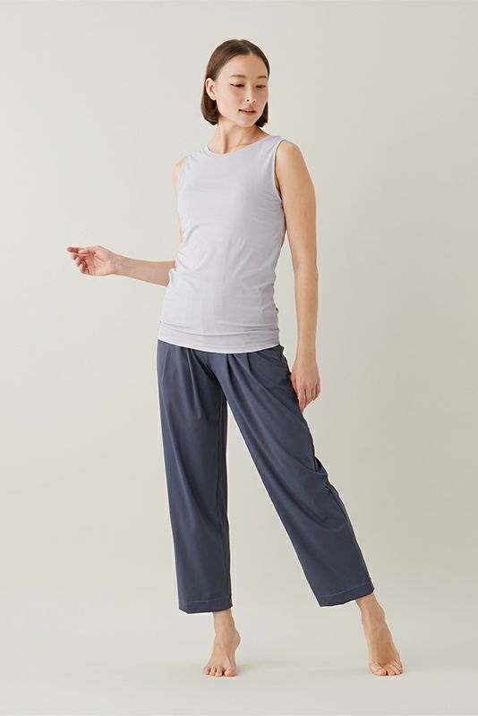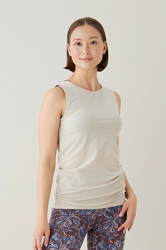 前から見るとスッキリしたデザインですが、後ろにはふんだんにギャザーが入ったノースリーブのプルオーバーです。前後逆にして着用もできますのでその日の気分でコーデが可能に。