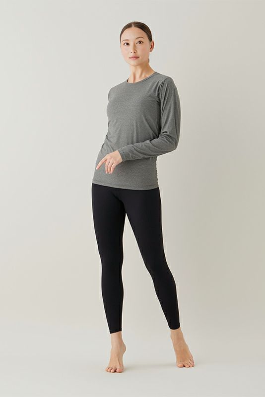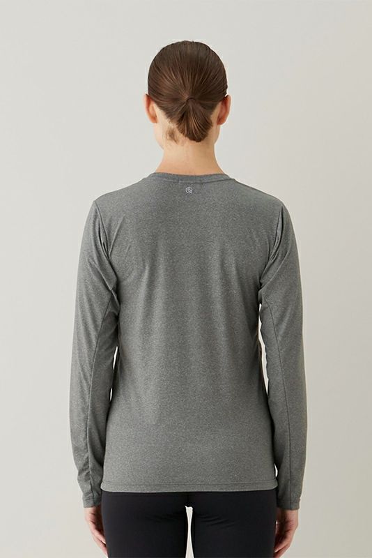 袖下にマチが付いており、腕の可動域が広がりやすい長袖プルオーバーです。やや細身で身体に程よくフィットするので、ピラティスやマシーントレーニングなどにもおすすめです。素材は多機能で耐久性もある、安定のスポーツウェア素材を使用しています。