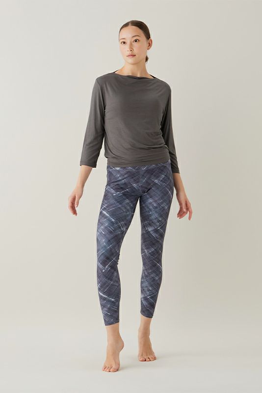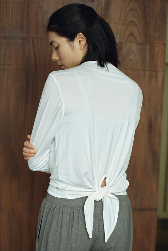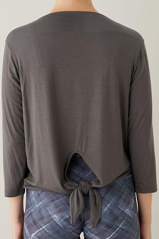 とろみのあるショート丈トップス。動きが多いポーズの場合は後ろを結んで着用してみたり、リラックスヨガの時は結ばず垂らして生地の滑らかさを生かす着こなしも◎