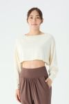 オーバーサイズのショートトップとボレロの2WAYで着用可能。程よいボリューム感もポイントで、十分なストレッチ性があり、ノーストレスな着心地。ヒアルロン酸加工を施しており、吸い付くようなモイスチャータッチが一度着たらやめられない気持ち良さ。トップス単体として着用したり、肌寒い時の羽織としても。真夏以外ではほぼ使えるヘビーユースのトップスです。