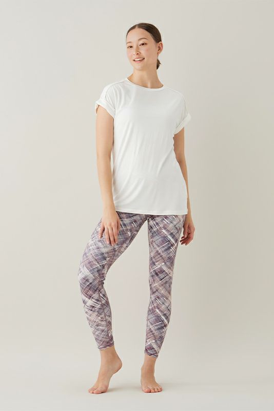 バンブー素材のロング丈半袖プルオーバー。シンプルな見え方ながら肩部分の切り替えが特徴的なデザインになっています。ヒップが隠れる着丈はレギンスコーデとも相性◎