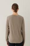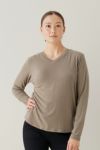 程よい深さのVネックは、首周りをスッキリ綺麗にみせてくれます。バックスタイルには、肩甲骨の動きを妨げない工夫をプラス。動きやすさをキープしつつ、ほどよくヒップをカバーしてくれる丈感も◎保温性と吸湿発熱機能付きで、寒い日もあたたかく快適に過ごせます。