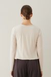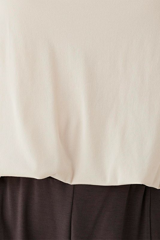 表側に透けすぎないメッシュ素材を使用したショート丈トップ。バルーン型の裾はショート丈とのバランスが◎。カップ付きなので一枚でサマになります。