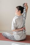 トラディショナルな日本手拭いに、ヨガをモチーフとした近代的な柄を総柄プリントしています。ヨガの際には汗を拭う以外にもロープ代わりに使ったり、シャバアーサナの際にアイマスクにしたり、頭の下に敷いたり、様々な使用の仕方を楽しめます。