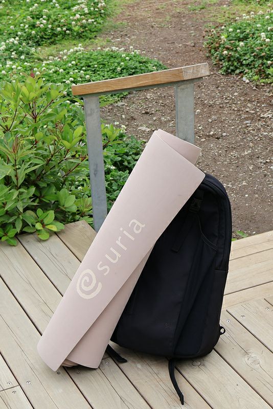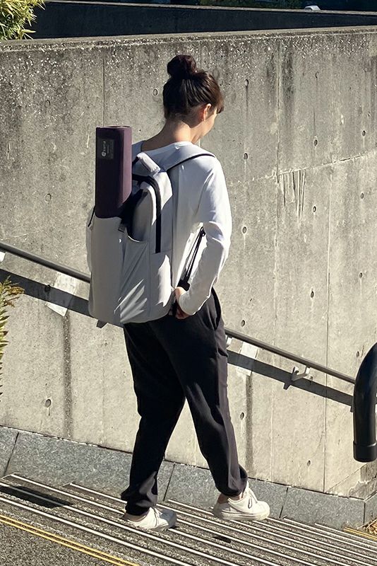 ヨガマットがタテに取り付けられるため人混みの中でも邪魔になりません。