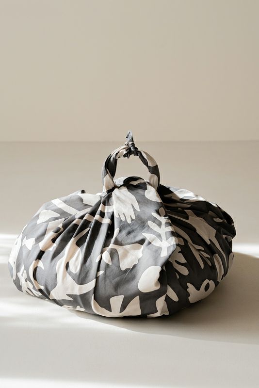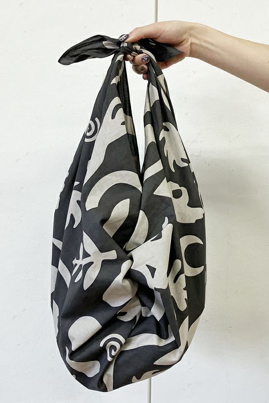 かまわぬの中でも一番大きいサイズの風呂敷に切り絵のようなオリジナルプリントを載せています。大判なので着替えやヨガマットをくるんで持ち歩いたり、マットの上に敷いたり、もちろんヨガ以外にも風呂敷ならではの多用途に対応できる優れものです。
