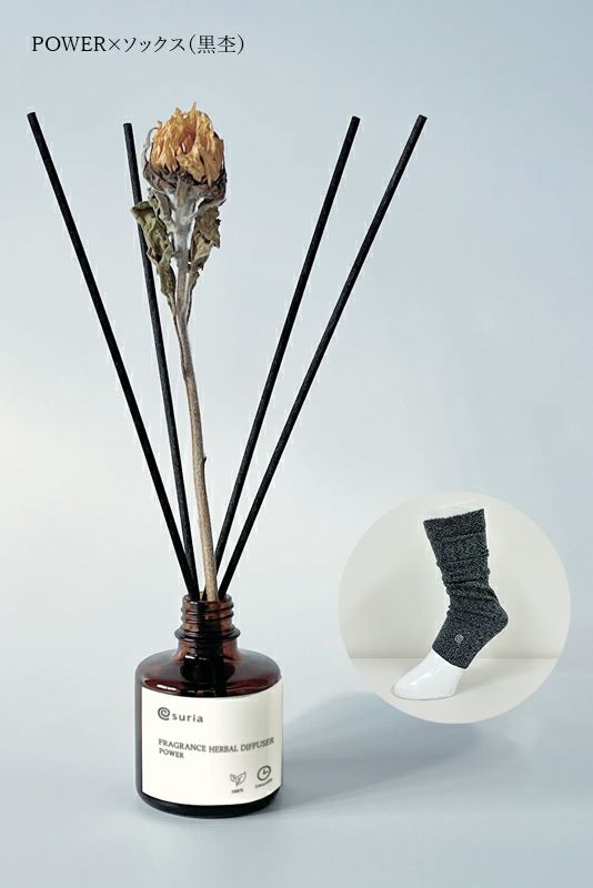 アロマディフューザーとソックスがセットになった、オンライン限定のsuriaオリジナルギフトBOXです。アロマディフューザーは1輪挿しの美しいハーブの彩りと、天然精油100%で調香した自然ならではの優しくて深みのある香りを日常にお届けします。