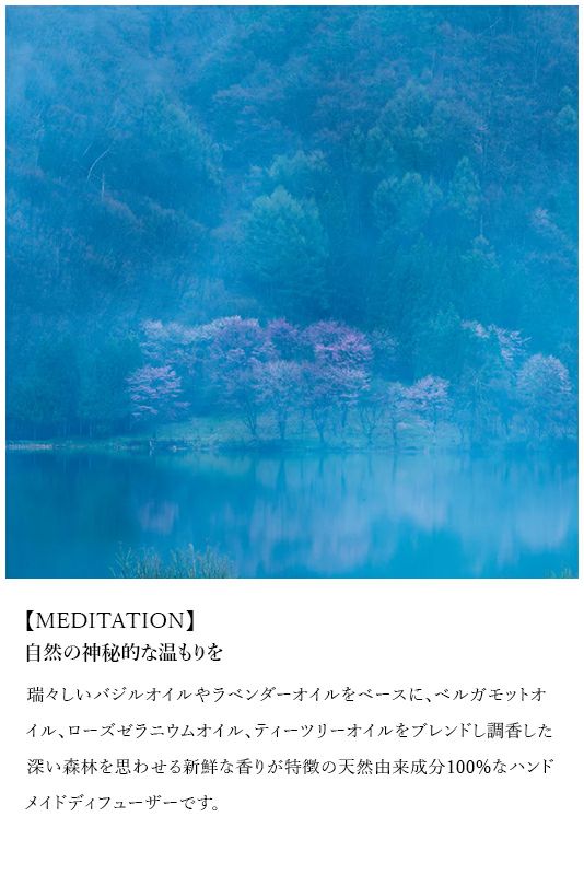 瑞々しいバジルオイルやラベンダーオイルをベースに、ベルガモットオイル、ローズゼラニウムオイル、ティーツリーオイルをブレンドし調香した、深い森林を思わせる新鮮な香りが特徴の天然由来成分100%なハンドメイドディフューザーです。