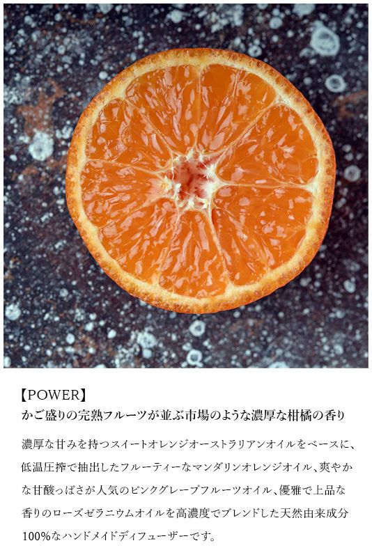 FRAGRANCE HERBAL DIFFUSER - RIPE ORANGE -は、濃厚な甘みを持つスイートオレンジオーストラリアンオイルをベースに、低温圧搾で抽出したフルーティーなマンダリンオレンジオイル、爽やかな甘酸っぱさが人気のピンクグレープフルーツオイル、優雅で上品な香りのローズゼラニウムオイルを高濃度でブレンドした天然由来成分100%なハンドメイドディフューザーです。