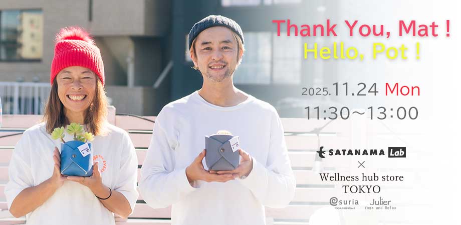 ヨガマットのUPサイクルSATANAMA Labとsuriaのコラボ企画!『Thank You, Mat!Hello, Pot!』を開催します。ご自身の使ってきたマットをご持参いただきラストヨガクラスに参加!(レンタルマットも可能)